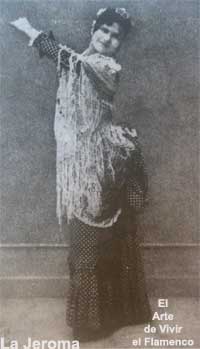 LA JEROMA, bailaora y cantaora de la más pura raza gitana, más conocida en nuestra historia del arte flamenco con el apodo artístico de LA JEROMA, nació en Jerez de la Frontera (Cádiz), siglo XIX, y murió en Sevilla siglo XX. Casada con Juan el de Alonso y madre de Currito el de La Jeroma. Fue figura en los cafés cantantes de su época. Fernando el de Triana, escribió de ella la siguiente semblanza: <<Dueña y señora de la simpatía en el Café de Silverio y donde quiera que se encontraba.