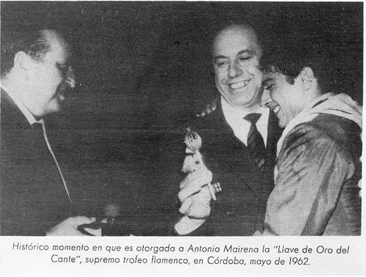 Estoy haciendo simplemente un comentario por encima, porque hablar de este cantaor ocuparía una de las grandes leyendas. Fue el cantaor predilecto de Antonio el bailaor, con quien realizo extensas giras por todo el mundo. Toma parte en el concurso para profesionales organizado en Córdoba, en el año 1.962 donde le fue otorgado el preciado galardón, de la llave de oro del cante, y un premio en metálico, de cien mil pesetas. En la fotografía momento histórico que le fue otorgado el supremo trofeo de mano de Antonio el Bailaor, en Córdoba.