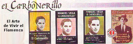Manuel Vega, El CARBONERILLO aunque su vida artística fue muy corta, lo suficiente para dejar una huella imborrable en el mundo del cante, sus fandangos y un amplio de estilos que llego a dominar con bastante perfección, su repertorio era muy amplio, especialmente por soleares, seguiríyas, tarantas, tangos, y cantes de ida y vuelta. Hablar de este gran artista Sevillano es recrear el más puro arte del cante que sé a conocido. Nunca repetía una letra todas de su propia creación, pues lo expresaba de lo más profundo de su alma.
