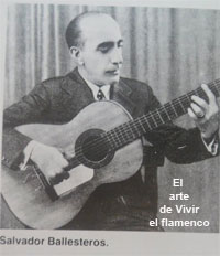 SALVADOR BALLESTEROS SEGURA, guitarrista de flamenco, más conocido en la historia del arte de la guitarra flamenca con su propio nombre artístico de SALVADOR BALLESTEROS, nació en Madrid en el año de 1876, y murió en su ciudad natal de Madrid en el año de 1956. Conoció desde niño a los grandes artistas del flamenco, que frecuentaban el colmao de su padre.